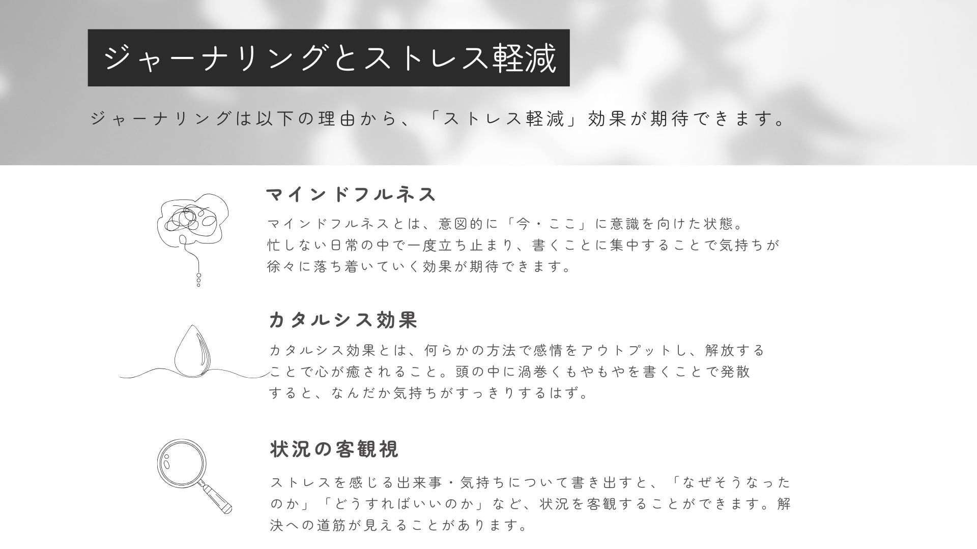 まずジャーナリングがどのようにストレス改善・セルフケアに繋がるかのメカニズムを解説。