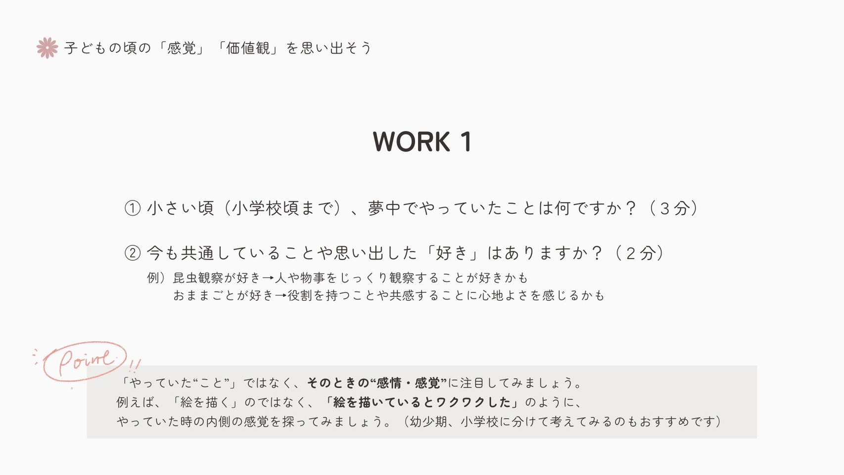 ひとつ目のワークで、小さい頃の好き=今の好きに繋がっていることを思い返しました。その好きが何に繋がってるのかは…なんだろう?でしたが、好き=大事にしていることだな、と気づきました。