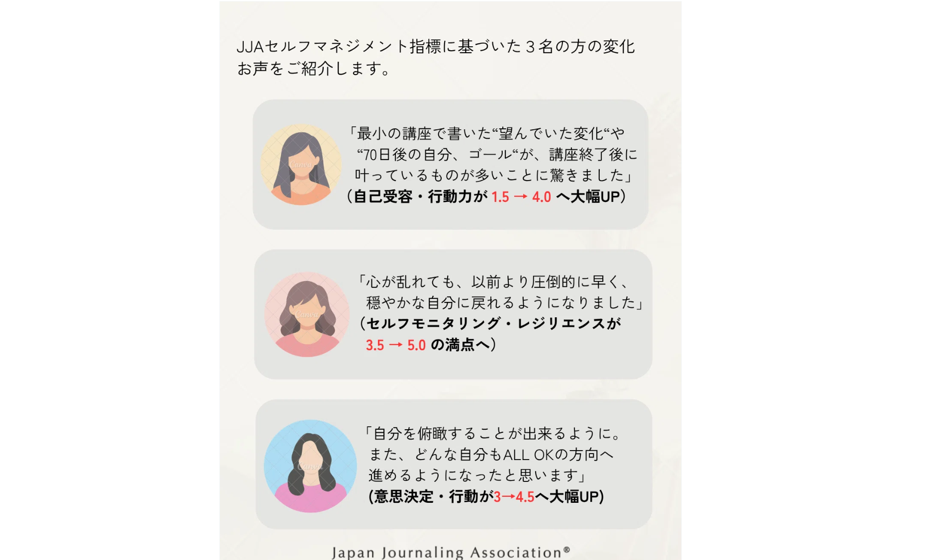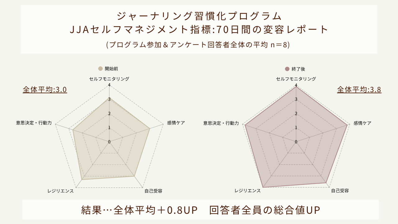 今回のプログラムでは、日本ジャーナリング協会(JJA)独自の「JJAセルフマネジメント指標」を用い、参加者の皆さまの心の変化を可視化しました。